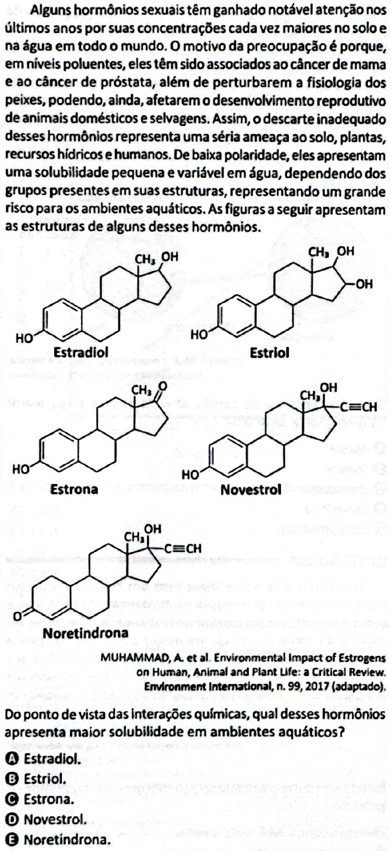 A molécula mais solúvel em água é o Estriol, pois possui três grupos hidroxila, sendo a mais hidrofílica.