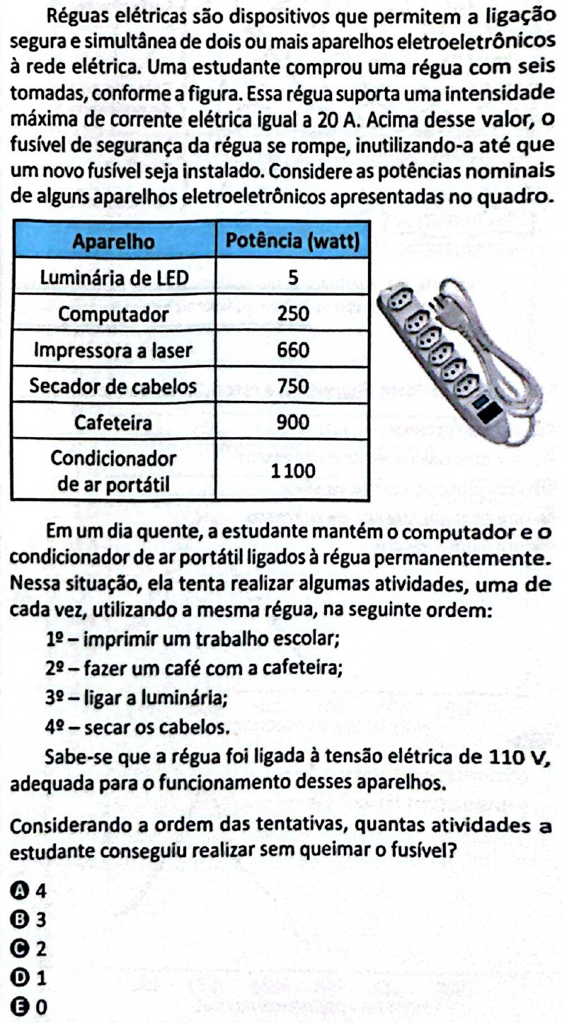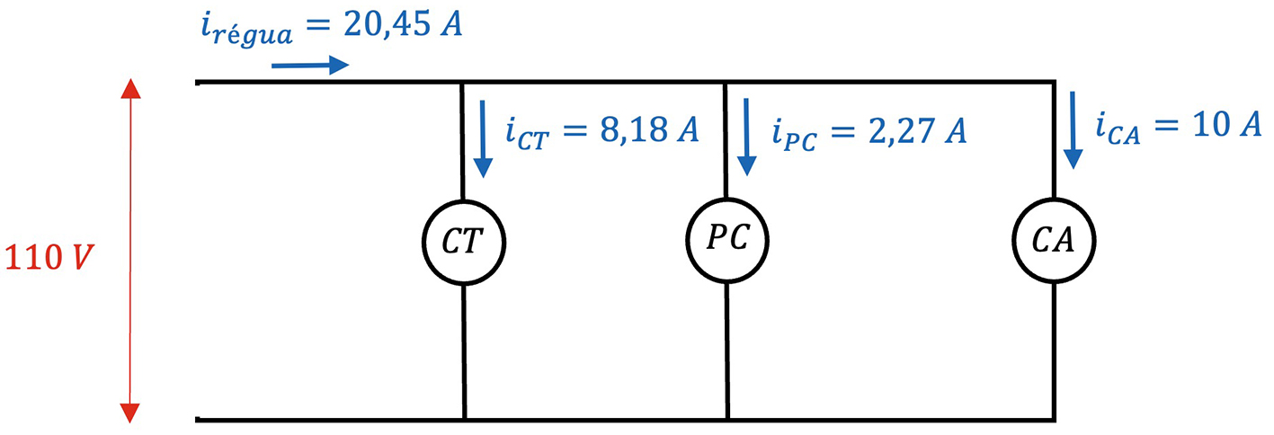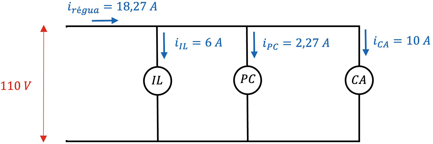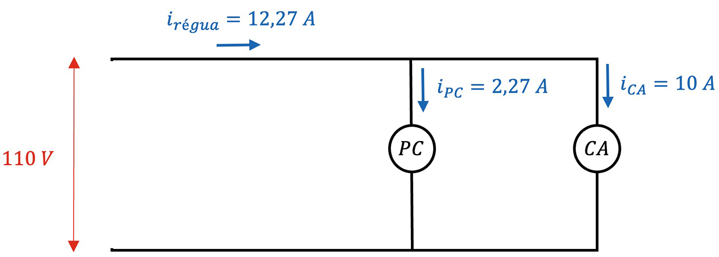 De acordo com a potência elétrica, ao ligar à régua o computador (PC) e o condicionador de ar (CA), é estabelecida a seguinte corrente na régua:
