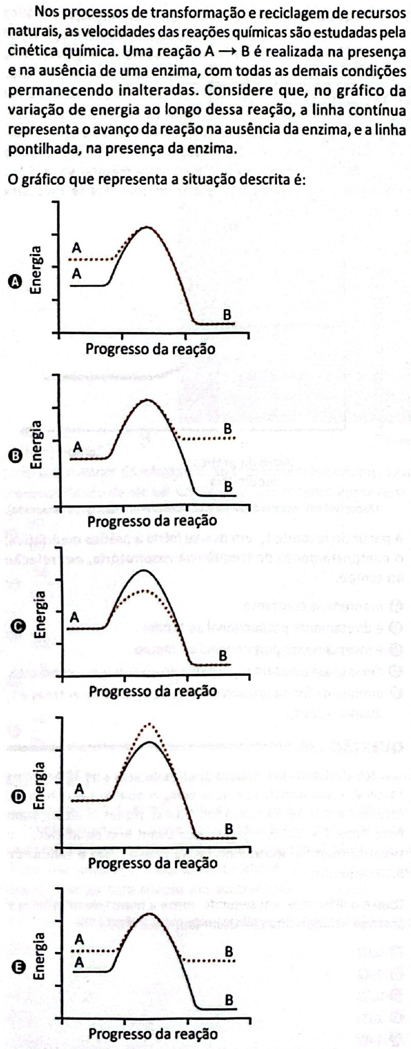 A enzima atua como um catalisador nas reações químicas, diminuindo a energia de ativação da reação, logo, a linha pontilhada, que representa a reação catalisada, deve apresentar energia de ativação menor do que a reação representada pela linha contínua, não catalisada.