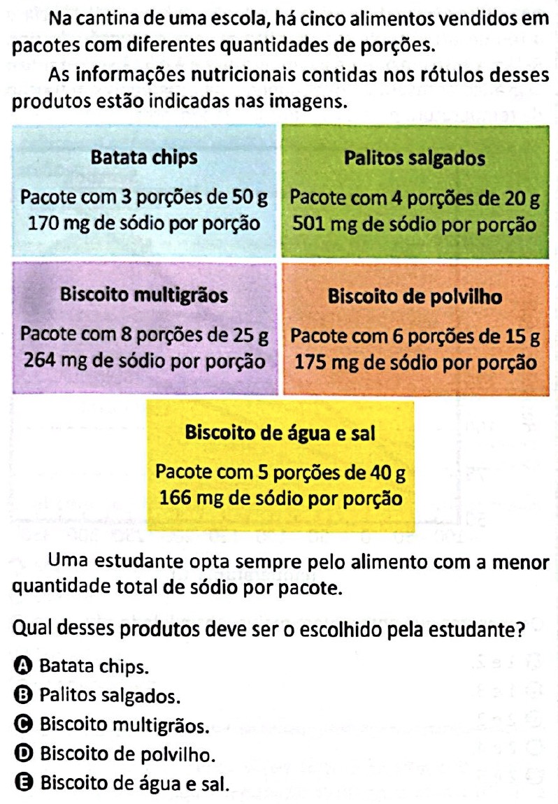 Logo, o produto que deve ser escolhido pelo estudante é o pacote de batata chips.