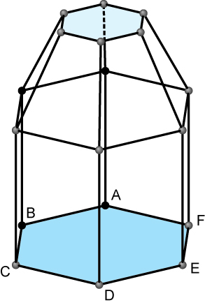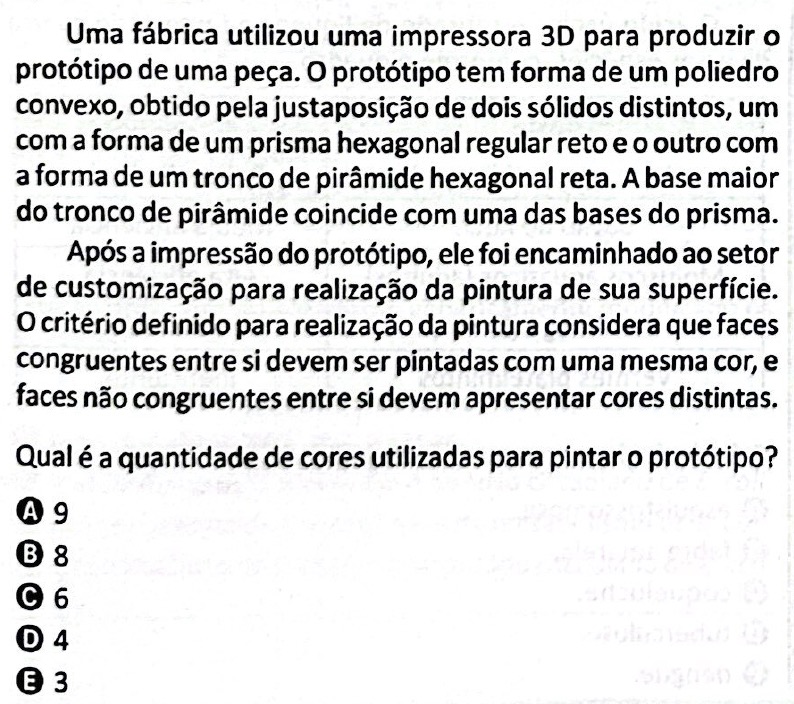 Pela análise da figura, tem-se que o poliedro em questão tem 2 faces hexagonais não congruentes entre si, 6 faces retangulares todas congruentes entre si e 6 faces trapezoidais todas congruentes entre si. Logo, será necessário 1 cor para a base hexagonal maior, 1 cor para as 6 faces laterais retangulares, 1 cor para as 6 faces trapezoidais e 1 cor para a face hexagonal menor, ou seja, 4 cores.