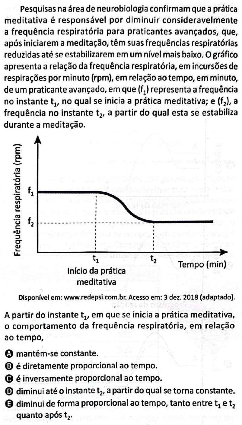 Pela análise direta do gráfico, a partir do instante t1, a frequência respiratória diminui até manter seu comportamento constante a partir do instante t2.