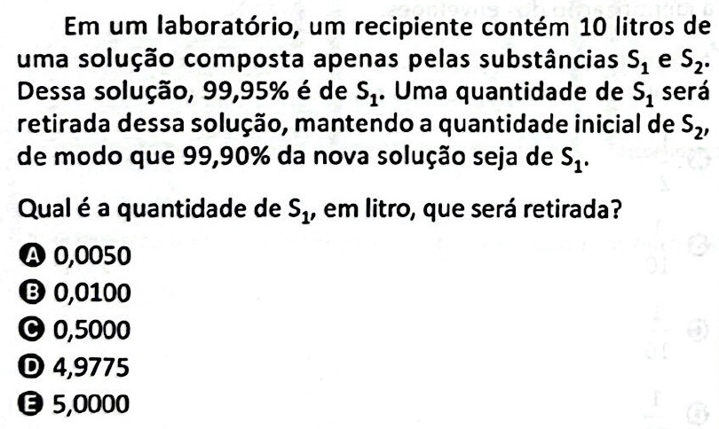 A porcentagem da substância S1 passará a ser 99,90%, e da substância S2, portanto, 0,1%.