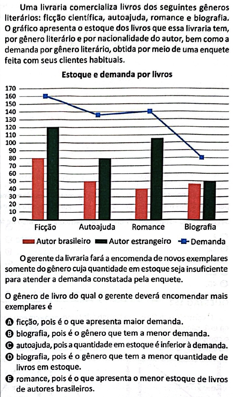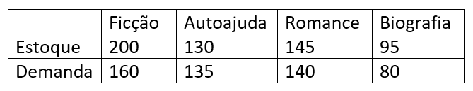 Portanto, o gênero cuja quantidade de livros em estoque é menor do que a demanda é o de autoajuda.
