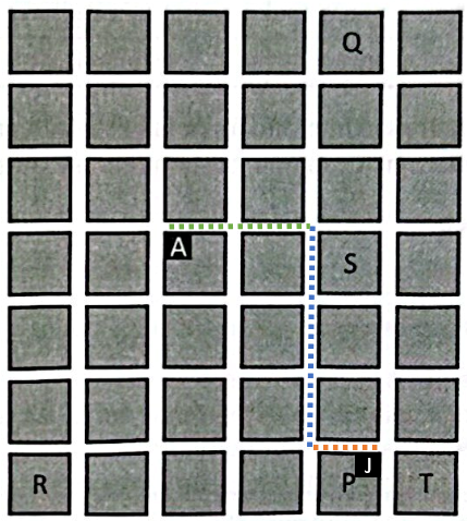 Alternativamente, pode-se fazer o trajeto inverso, ou seja, saindo da casa do amigo até à casa de João, temos que caminhar dois quarteirões a leste, dobrar à direita, caminhar 3 quarteirões na direção sul, dobrar à esquerda e caminhar pelo quarteirão na direção leste até a esquina na extremidade nordeste.