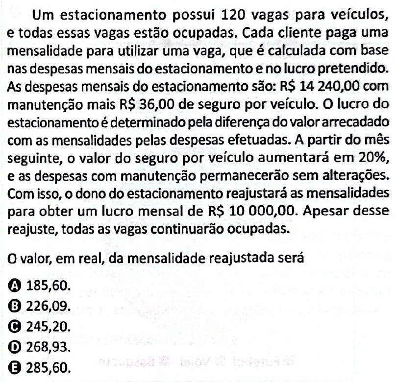 Após o aumento de 20%, o valor do seguro por veículo passa a ser de R$ 36,00 · 12 = R$ 43,20. Como são 120 veículos, o custo total do seguro é de
