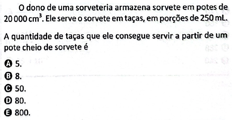Como 1 cm3 equivale a 1 mL, o pote de sorvete tem 20000 mL. As taças, por sua vez, têm 250 mL.
