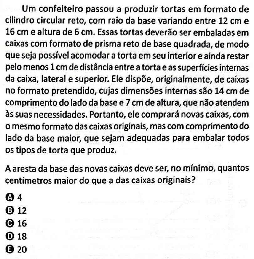 Como as tortas terão os raios de suas bases variando entre 12 cm e 16 cm então o maior diâmetro da base de uma torta será de 32 cm. Assim, para garantir que todos os tipos de torta caibam na embalagem com uma folga nas laterais de 1 cm, devemos ter a aresta da base da embalagem medindo 34 cm, o que representa um aumento de 20 cm em relação à medida da aresta da base da embalagem que ele possui. Portanto, alternativa E.