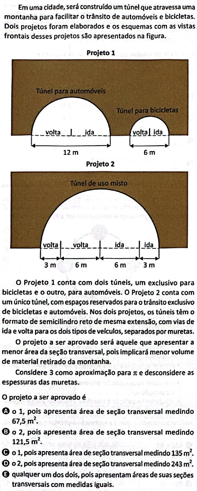Sabendo que a área da seção do túnel é A seção = com r sendo o raio do túnel. Calculando a área da seção transversal de cada projeto e definindo