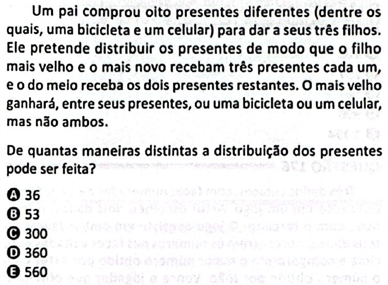 Como o irmão mais velho deve ficar com a bicicleta ou com o celular, mas não ambos, então quantidade de maneiras distintas de distribuir os presentes a ele é dado por: