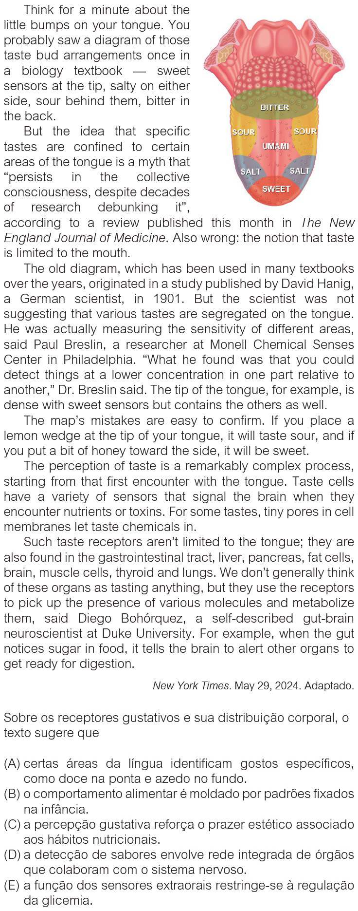 Lê-se em: “The perception of taste is a remarkably complex process, starting from that first encounter with the tongue. Taste cells have a variety of sensors that signal the brain when they encounter nutrients or toxins.”.