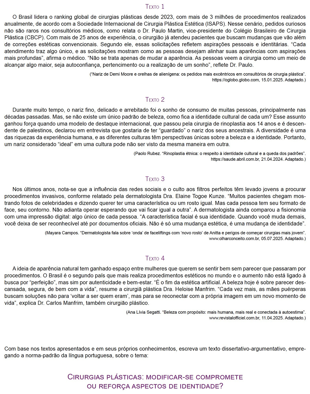 O primeiro texto apresenta o fato de que o Brasil é líder mundial em número de cirurgias plásticas desde 2023, e muitos pedidos vão além da estética convencional, refletindo desejos identitários. Isso porque, segundo especialistas, os pacientes buscam alinhar aparência com aspirações profundas, como autoconfiança e pertencimento. Desse modo, esse primeiro texto motivador sugere que a cirurgia plástica pode reforçar aspectos da identidade, pois é vista como um meio de expressar quem a pessoa deseja ser, de modo que a mudança não é necessariamente superficial, mas ligada à autoestima e à realização pessoal.