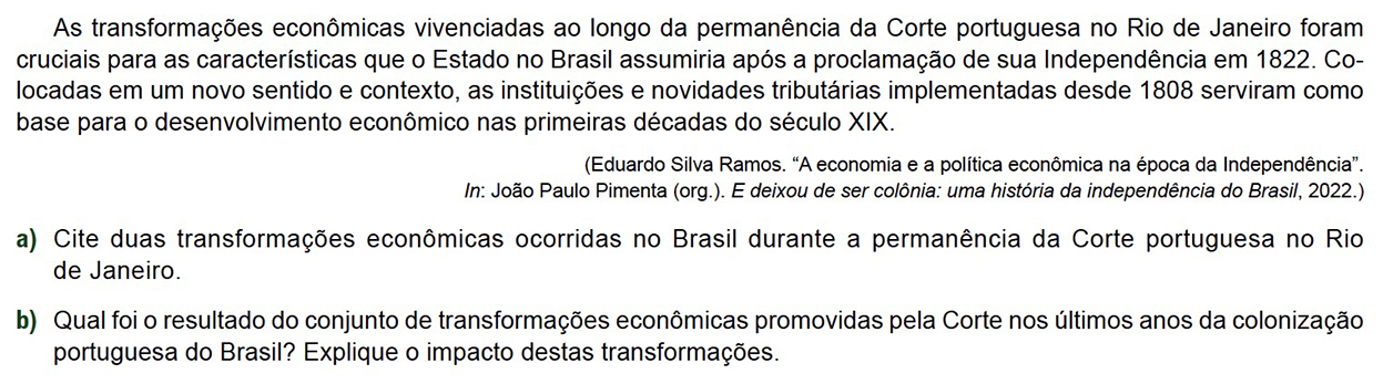 b) O conjunto dessas reformas contribuiu para desestruturar definitivamente o Antigo Sistema Colonial que por séculos estruturou o domínio de Portugal sobre o Brasil. Com o fim do antigo “pacto colonial”, ocorreu um fortalecimento dos grupos mercantis locais (com forte destaque aos comerciantes de africanos escravizados). Além disso, gradativamente o comércio direto entre Brasil e Inglaterra se tornou mais importante que o fluxo econômico que vinha ocorrendo com Portugal. Essa crescente autonomia econômica favoreceu as elites do Brasil e possibilitou a formação de bases institucionais que se mostraram determinantes na Independência de 1822 (momento no qual precisamente essas mesmas elites interpretaram que a ruptura política seria a melhor forma de assegurar a recém-adquirida autonomia econômica).