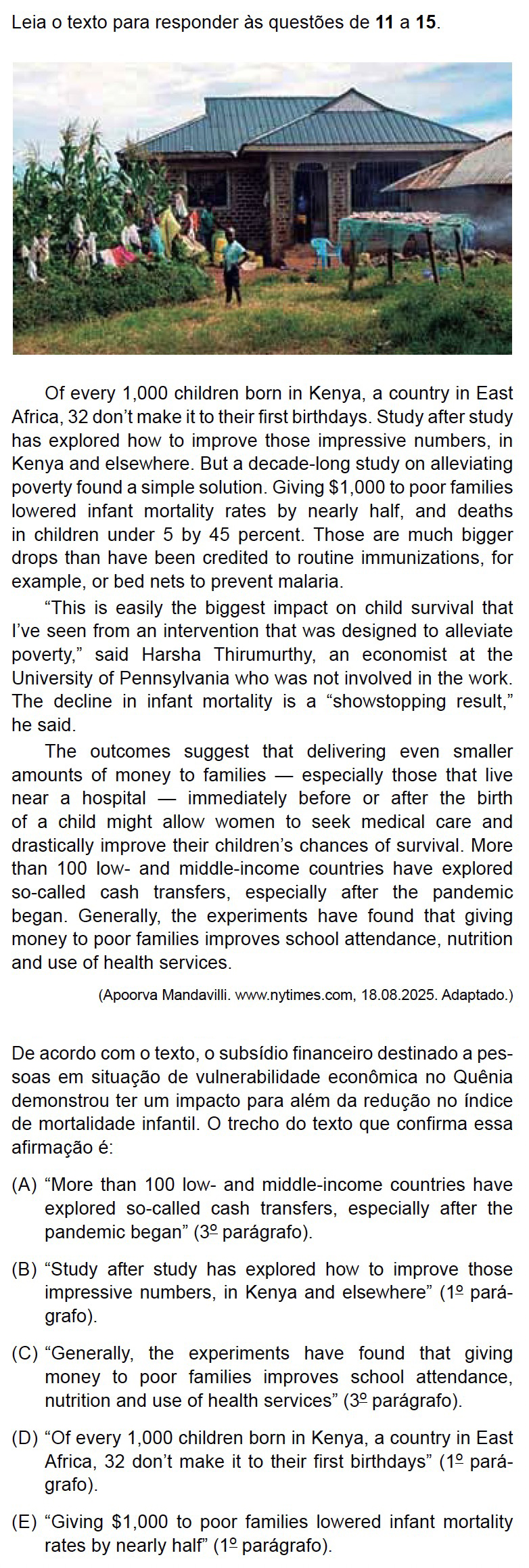 O trecho do 3º parágrafo, “No geral, os experimentos descobriram que dar dinheiro para famílias pobres melhora a frequência nas escolas, na nutrição e no uso dos serviços de saúde”, demonstra um impacto para além da redução no índice de mortalidade infantil.