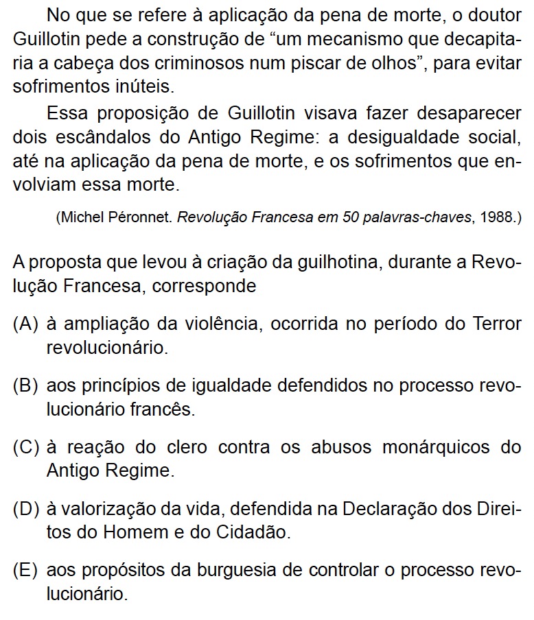 O excerto destaca que a proposta de Joseph-Ignace Guillotin, médico e então deputado da Assembleia Nacional, buscava eliminar dois “escândalos” do Antigo Regime: (i) a desigualdade social na aplicação da pena de morte (na época, eram aplicadas penas diferentes conforme a condição social do condenado); e (ii) os sofrimentos físicos causados pelas execuções.