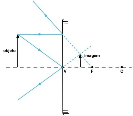 De acordo com o esquema construído, podemos afirmar que os espelhos esféricos convexos formam, para objetos reais, imagens sempre virtuais e direitas (em relação ao objeto), independentemente da posição do objeto em relação ao espelho. No entanto, como pode ser observado no esquema, sempre há redução do tamanho da imagem em relação ao tamanho do objeto.