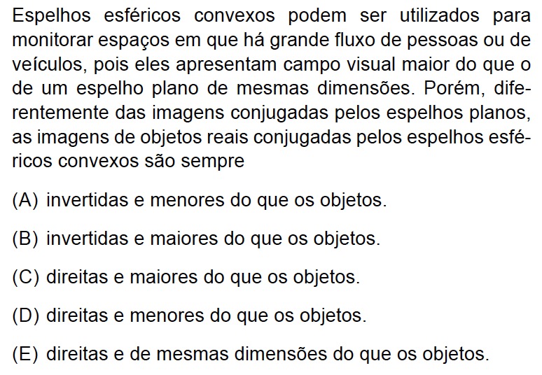 Portanto, as imagens formadas por espelhos convexos, para objeto reais, são sempre virtuais, direitas e menores do que o objeto, o que está de acordo com a alternativa D.