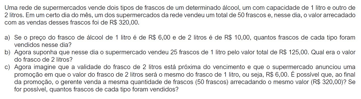 b) Se nesse dia foram vendidos 25 frascos de 1 litro pelo valor total de R$ 125,00, então, foram vendidos 25 frascos de 2 litros pelo valor total de R$ 195,00, assim, o preço de venda de cada frasco de 2 litros é .