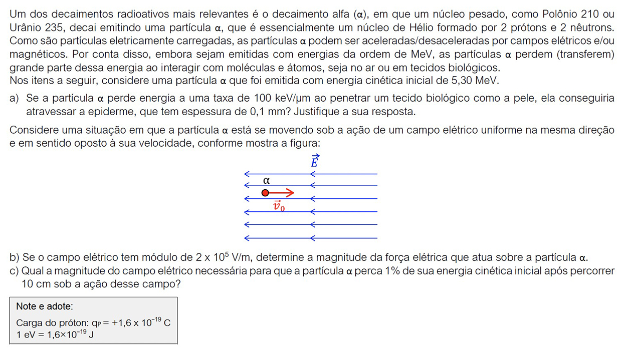 a) Por condição, a partícula perde energia a uma taxa de 100 keV por micrômetro. Portanto, a energia perdida (EP) ao atravessar a epiderme com espessura de 0,1 mm (10-1 mm) é dada por: