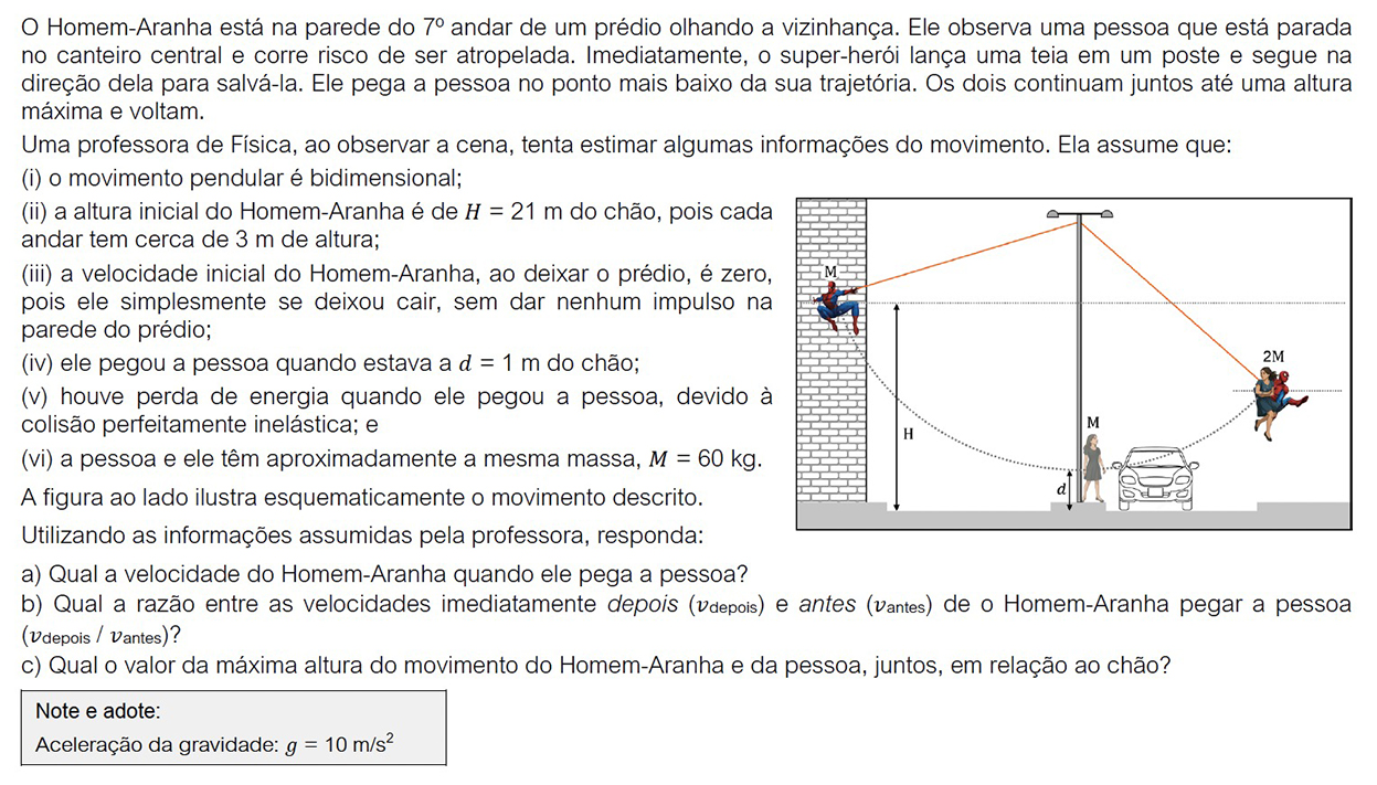 a) Admitindo que a energia mecânica do Homem-Aranha se conserve quando ele vai da situação representada na Imagem I para II.