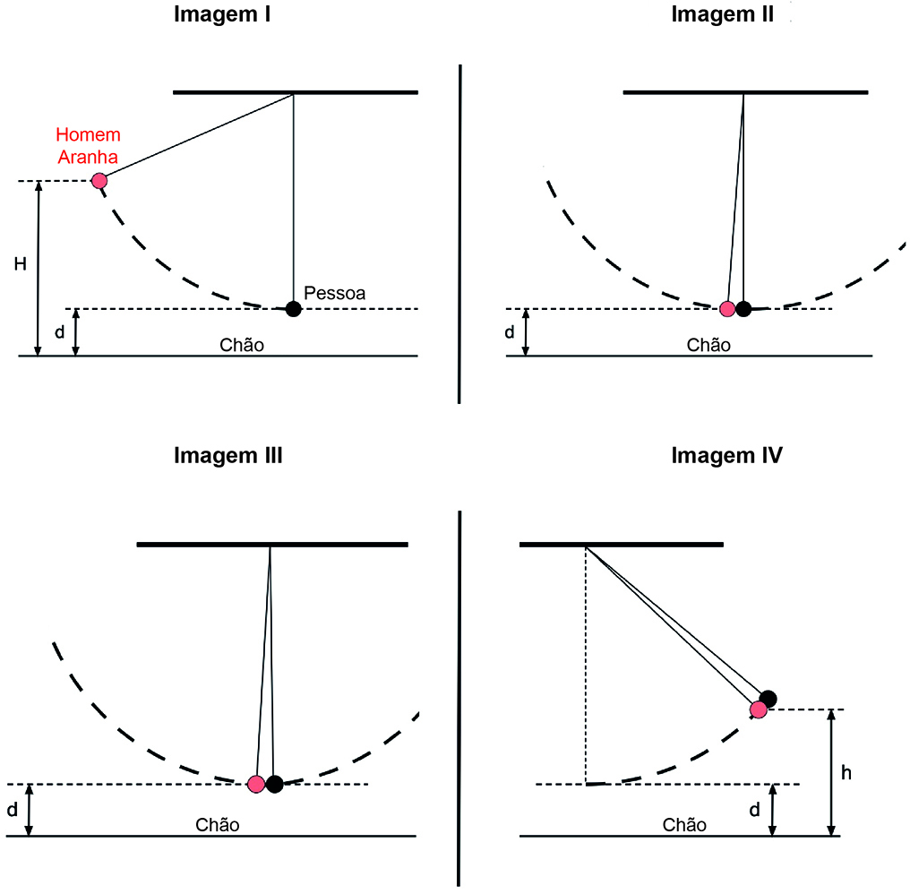 Na situação descrita ocorreram três eventos, (1) a descida do Homem-Aranha, (2) a colisão do Homem-Aranha com a pessoa e (3) a subida do sistema formado pelo Homem-Aranha e pela pessoa. Cada imagem a seguir representa o início e o final de cada um dos eventos.