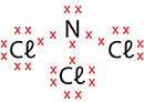 Pela distribuição eletrônica fornecida, o nitrogênio e o cloro possuem, na camada de valência, cinco elétrons e sete elétrons, respectivamente.