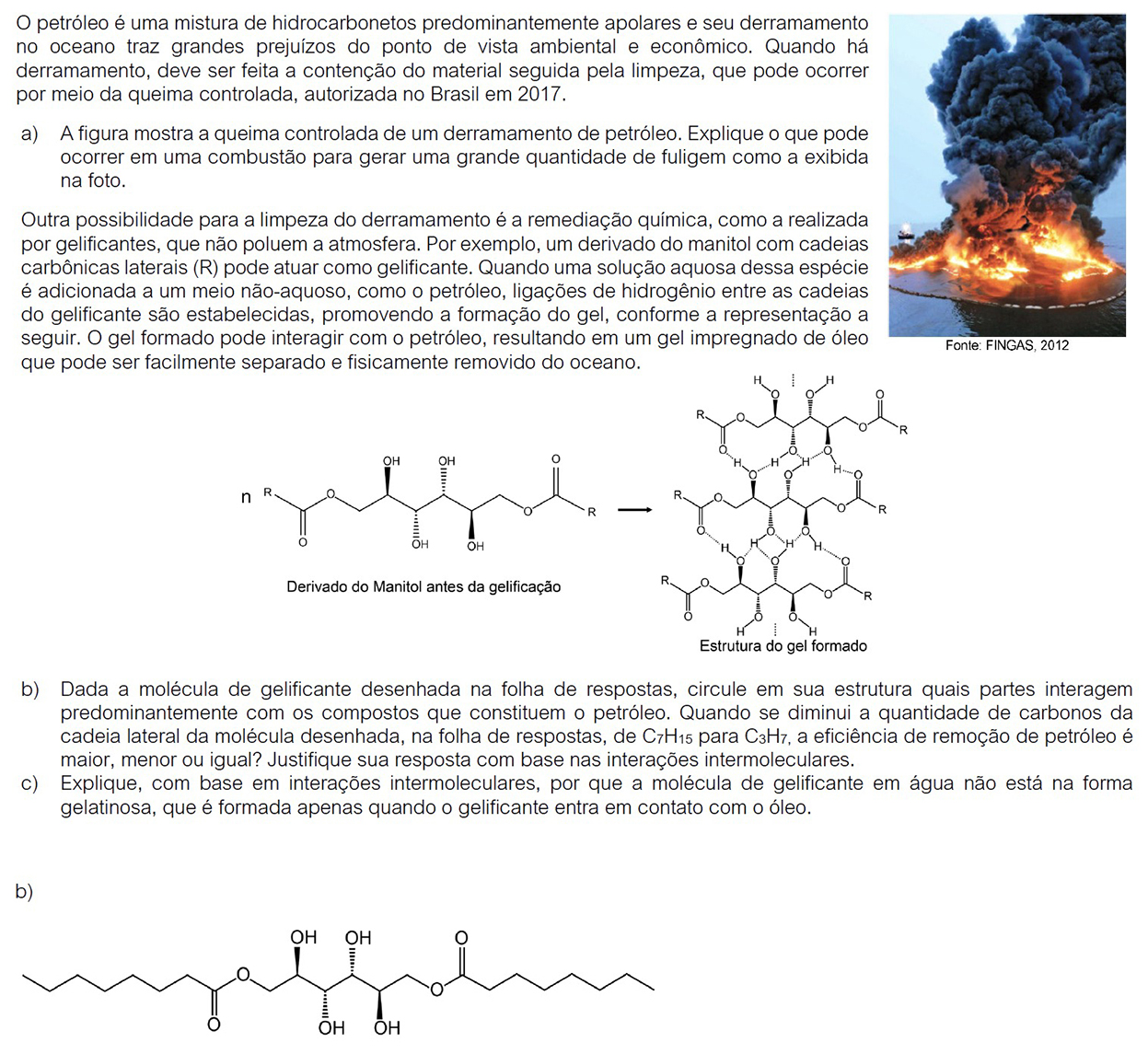 c) Em meio aquoso, as moléculas do gelificante não assumem a forma de gel, pois interagem com as moléculas de água por meio de ligações de hidrogênio, em vez de interagirem entre si. No entanto, ao entrar em contato com o óleo, composto predominantemente por moléculas de caráter apolar, as moléculas do gelificante passam a interagir entre si por ligações de hidrogênio, resultando na formação do gel.