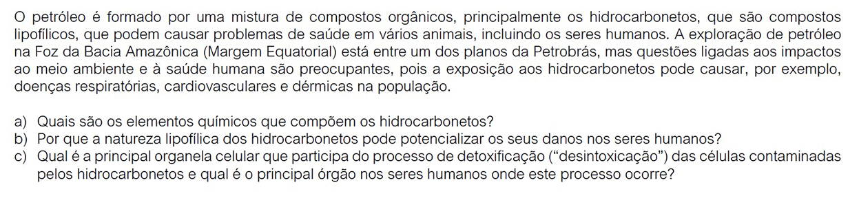 b) A natureza lipofílica dos hidrocarbonetos favorece a entrada nas células humanas, atravessando facilmente a membrana fosfolipoproteica, além de eles apresentarem a tendência de se acumularem em tecidos com natureza lipídica. Em seguida, os hidrocarbonetos podem prejudicar o funcionamento celular, uma vez que as células não apresentam aparato enzimático capaz de degradá-los. Assim, permanecendo nos órgãos, podem induzir danos aos pulmões, coração e pele, por exemplo.