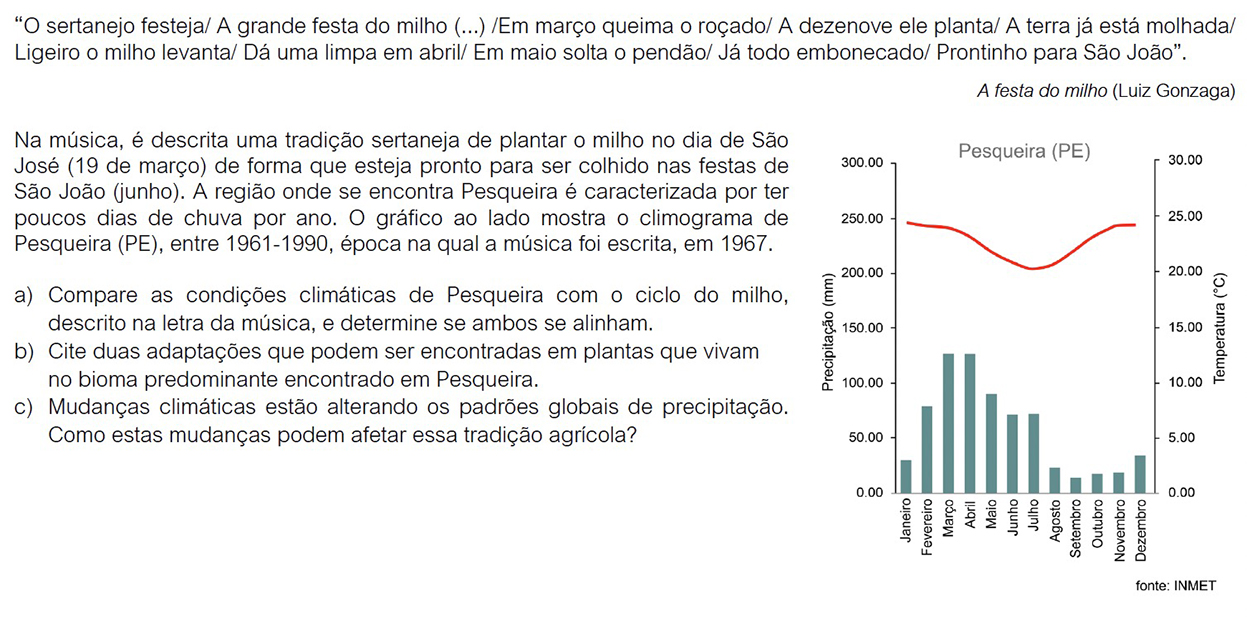 a) O ciclo do milho e a letra da música de Luiz Gonzaga se alinham. Em março, após a preparação do solo (“Em março queima o roçado”), o milho é plantado (“A dezenove ele planta”), o que coincide com período de maior pluviosidade e de altas temperaturas em Pesqueira (em março e abril, quando “A terra já está molhada”), o que, por sua vez, favorece a germinação, o crescimento e o desenvolvimento das plantas.