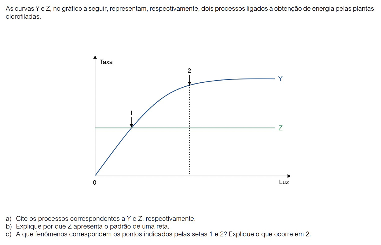 c) O ponto 1 corresponde ao ponto de compensação fótico (ou ponto de compensação luminosa). Em 2 ocorre a saturação das clorofilas, levando à saturação luminosa.