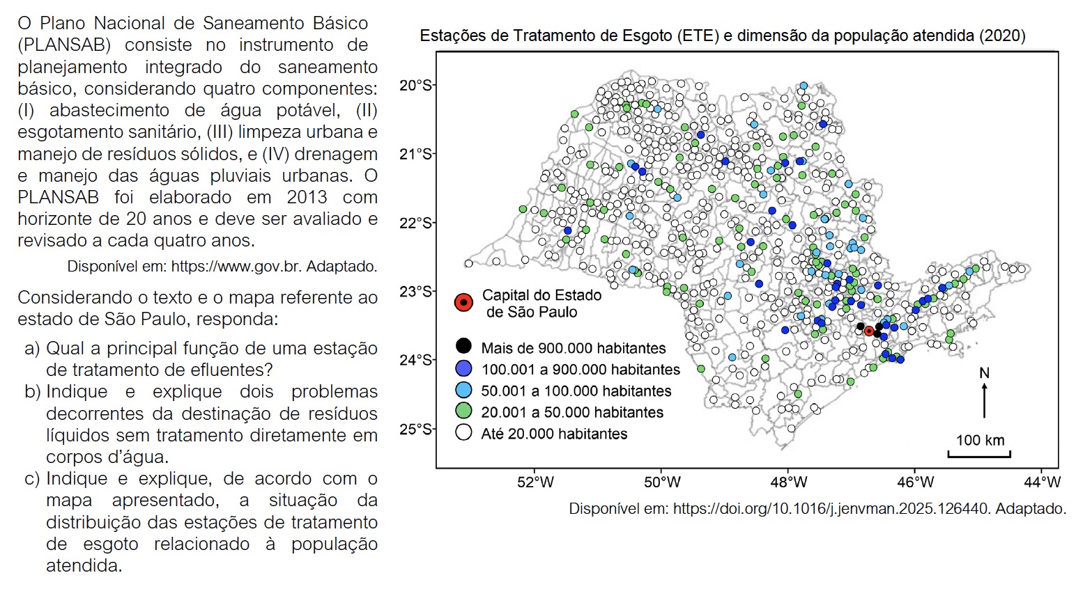 c) O mapa mostra a pequena concentração de Estações de Tratamento de Esgoto (ETE) para mais de 900.000 habitantes na região metropolitana de São Paulo, onde há maior demanda. É possível identificar também a presença de Estações de Tratamento de Esgoto (ETE) para 100.001 e 900.000 mais próximas de regiões metropolitanas como Campinas, Sorocaba, Baixada Santista, Ribeirão Preto e São José dos Campos, que concentram parcela significativa da população. Mas, na maior parte do estado de São Paulo prevalecem Estações de Tratamento de Esgoto (ETE) de pequeno porte, para até 20.000 habitantes.