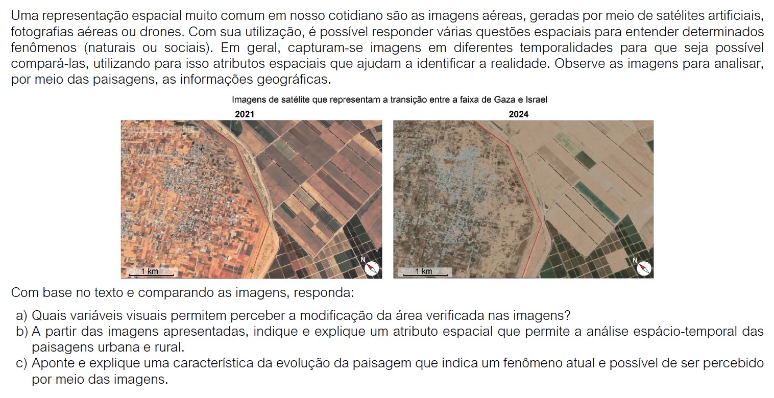 c) As duas áreas estão divididas na imagem por uma linha vermelha, fato que favorece visualizar os padrões de uso de terra. Nota-se que o conflito deflagrado em 2023 entre o grupo palestino Hamas e o governo israelense gerou impactos na paisagem, levando ao abandono de algumas das áreas agrícolas da região destacada, ao mesmo tempo que ocorreu uma ocupação militar na faixa de Gaza que destruiu a maior parte de sua estrutura urbana.