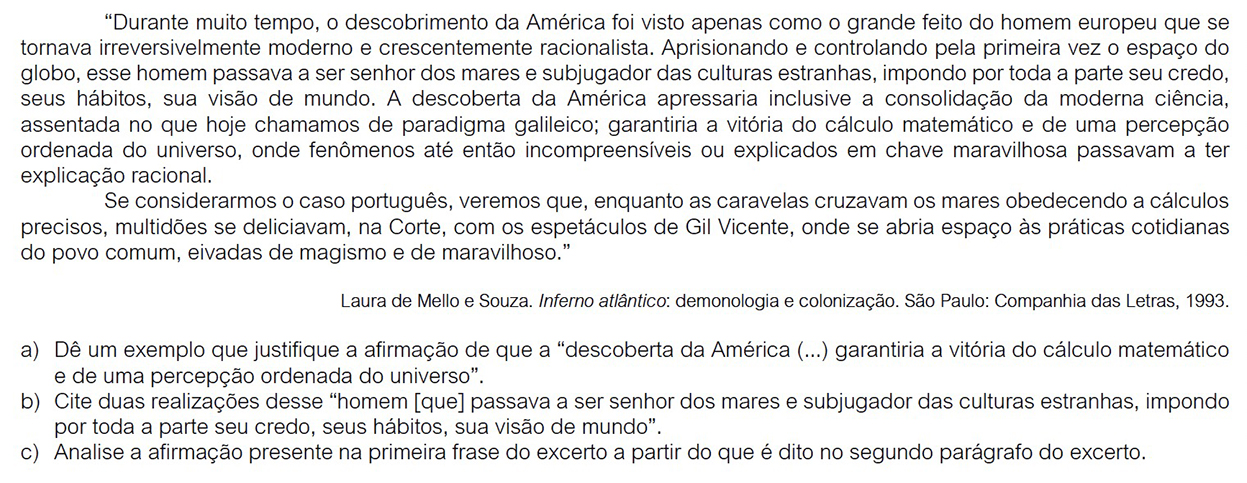 a) A descoberta da América, inserida no contexto das Grandes Navegações, resultou de mudanças nas mentalidades ocorridas ao final da Idade Média, quando o uso da razão se tornou determinante, com a valorização da medição, da previsão e do cálculo. Instrumentos como o astrolábio e a bússola, aliados ao desenvolvimento da cartografia e das cartas náuticas, permitiram o planejamento racional das rotas marítimas. Assim, os mares deixaram de ser vistos como espaços míticos e imprevisíveis e passaram a ser ordenados por mapas, números e leis naturais em consonância com o chamado paradigma galileico.