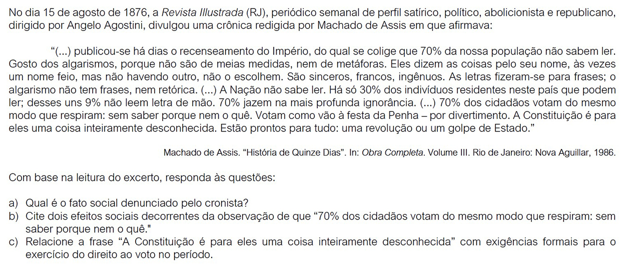 a) Na crônica, é denunciada a alta taxa de analfabetismo da população brasileira no Império.