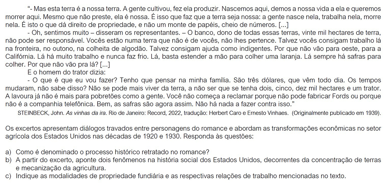 c) O excerto menciona o processo de concentração de terras nas mãos de poucos proprietários, em que prevalece o trabalho assalariado com baixa remuneração e, por diversas vezes, em empregos temporários. Essa modalidade aparece em contraposição à pequena propriedade, marcada pelo emprego do trabalho familiar.