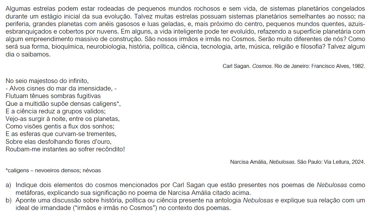 a) Vários elementos do cosmos citados por Sagan são utilizados como metáforas na obra Nebulosas, tais como estrelas, planetas e luas. No poema citado, “mar da imensidade” é metáfora para o próprio cosmos. Além disso, as nuvens referidas por Sagan são metaforizadas na imagem de “alvos cisnes”, os quais se tornam “visões gentis” que por instantes atenuam o “sofrer recôndito” da enunciadora.