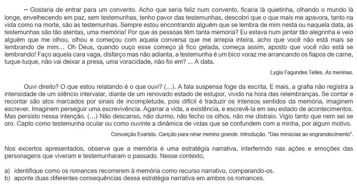 b) Em Canção para ninar menino grande, a memória sustenta a ancestralidade, a narrativa coletiva e a reelaboração simbólica das feridas, além de reforçar a consciência de que todo relato carrega marcas de incompletude. Já em As meninas, lembrar expõe dores íntimas, acentua a vulnerabilidade das personagens e evidencia rupturas que não encontram cura. A memória assume também um papel de testemunho histórico, especialmente quando surge o panfleto de um preso político relatando as torturas sofridas durante a ditadura militar.