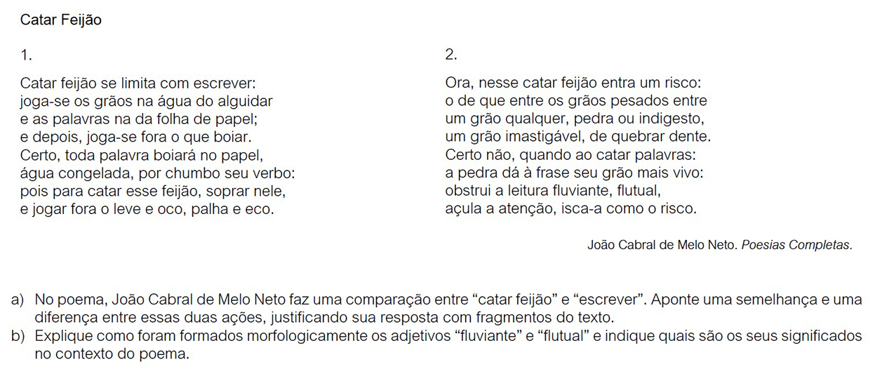a) A semelhança é que, para cozinhar o feijão, em primeiro lugar, é preciso selecionar os melhores grãos; para escrever, é necessário, antes de tudo, escolher as melhores palavras. Isso pode ser feito com ajuda de um vaso de água. Por isso, o eu lírico afirma: “joga-se os grãos na água do alguidar / e as palavras na da folha de papel; / e depois, joga-se fora o que boiar.” Assim, aquilo que boia é “o leve e oco, palha e eco” e que, por isso, não serve para ser cozinhado ou escrito.