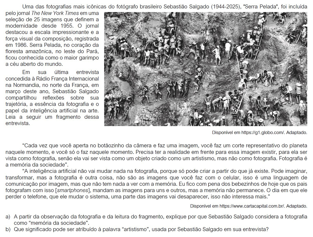 a) Sebastião Salgado entende a fotografia como a “memória da sociedade” porque ela funciona como um registro permanente e fidedigno de um momento específico da realidade. Segundo o fotógrafo, o ato de fotografar consiste em realizar um “corte representativo do planeta naquele momento”, capturando uma cena que é única e irrepetível. Para que uma imagem seja considerada fotografia, na concepção de Salgado, é imprescindível que ela tenha a “realidade em frente”, ou seja, que documente um acontecimento verídico. A fotografia “Serra Pelada” é um exemplo emblemático dessa visão, pois ela não apenas registra, mas eterniza a escala monumental e a condição humana no garimpo durante a década de 1980. Ao preservar essa cena histórica, a imagem transcende o mero registro visual e se converte em um documento, um testemunho que permite às gerações futuras conhecer e refletir sobre aquele período. Dessa forma, a fotografia se torna um pilar da memória coletiva, guardando fragmentos da história e da experiência humana para a posteridade, em contraste com a efemeridade das imagens digitais cotidianas que, segundo ele, não possuem a mesma vocação para a permanência.
