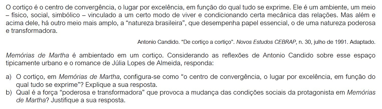 a) No romance de Aluísio Azevedo, o espaço físico do cortiço possui grande centralidade, chegando mesmo a ocupar a dimensão de personagem. Já em Memórias de Martha, essa centralidade é mais diluída, porque há, ao menos, outro ambiente de grande importância na obra: a escola. Além disso, a generalização presente na afirmação de Antonio Candido, segundo a qual “tudo se exprime” em função daquele espaço físico, também não encontra correspondência em Memórias de Martha, na medida em que a narradora se expressa com alto teor de subjetividade, transmitindo ao leitor as suas impressões pessoais a respeito das experiências que vive.