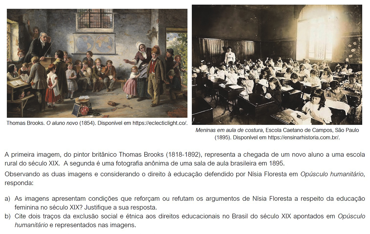 a) Em sua obra, Nísia Floresta defende a promoção da educação feminina como forma de colocar o Brasil no mesmo patamar de países europeus. As imagens reforçam as ideias defendidas pela autora. Na tela de Thomas Brooks, a presença mista de meninos e meninas na sala de aula evidencia a prática de um ensino igualitário, independente de gênero, como Nísia propunha em seus artigos. A fotografia, que retrata uma sala de aula brasileira, associa o aprendizado das meninas a tarefas domésticas, como a costura, das quais estavam isentos os meninos. Estes, por sua vez, tinham acesso a conhecimentos mais aprofundados de aritmética e ciências, por exemplo, que era vedado às meninas. Essa distinção entre educação masculina e feminina é combatida por Nísia no Opúsculo Humanitário.