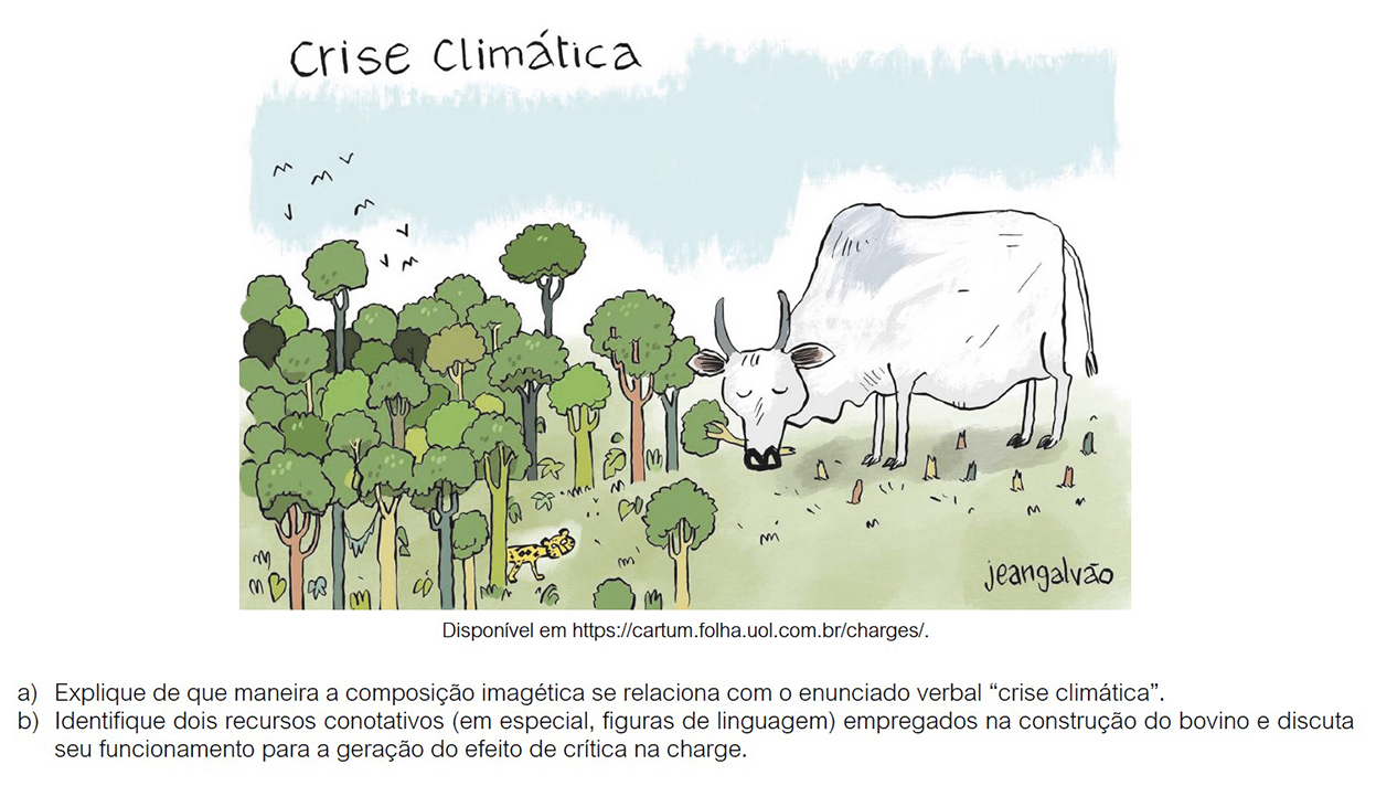a) A imagem apresenta figuras reconhecíveis: no lado esquerdo, árvores, pássaros, uma onça; no lado direito, um boi. Os elementos apresentados à esquerda são parte de um todo que vem a ser o meio ambiente preservado. Nesse sentido, representam justamente a natureza intocada. A figura do boi também funciona de modo semelhante: por ser parte de um todo que vem a ser a boiada, representa a atividade pecuária. Como o bovino, em sua pastagem, alimenta-se de um dos elementos da natureza preservada (uma árvore), a charge sugere a ideia de que a pecuária “devora” o meio ambiente natural, isto é, atua como agente da devastação. São conhecidos os efeitos nocivos da pecuária predatória: a criação de pastos envolve o desmatamento, seguido da queima do material orgânico restante, o que acaba produzindo a alta emissão de poluentes atmosféricos – fatores decisivos para o estabelecimento da “crise climática” mencionada pela charge.