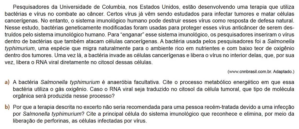 b) Tendo sido infectada previamente pela Salmonella typhimurium, a pessoa teria produzido anticorpos para combater a infecção e estabelecido memória imunológica. Dessa forma, ao receber esse mesmo microrganismo em seu corpo para o tratamento, seu sistema imunológico produziria anticorpos mais rápida e intensamente, eliminando grande parte dessas bactérias antes que atingissem as células desejadas.