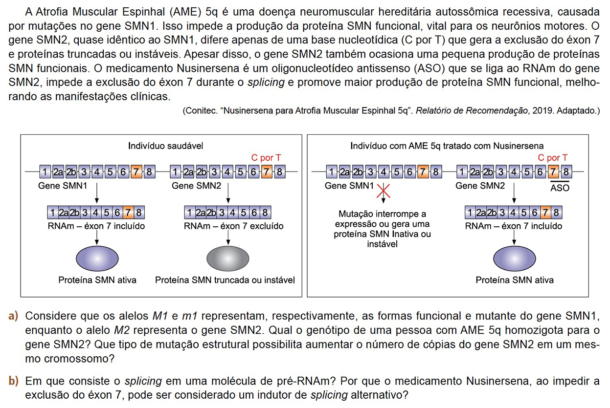 O medicamento Nusinersena atua permitindo que o éxon 7 seja incluído no RNAm final, de modo a alterar a expressão do gene SMN2, que naturalmente excluiria esse éxon. Esse processo induzido pelo medicamento é considerado uma forma de splicing alternativo.