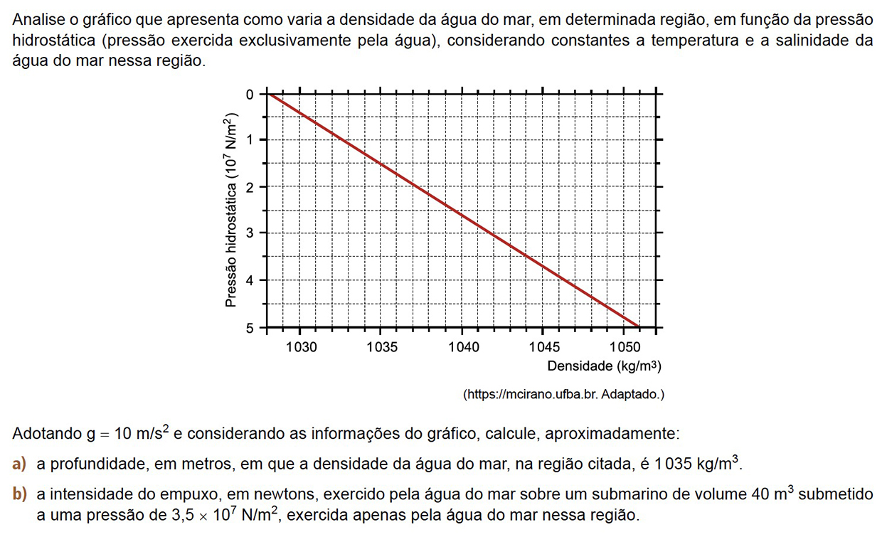 Observação: para resolver o item “a”, foi utilizada uma expressão (Teorema de Stevin) que só vale caso a densidade do fluido e a intensidade do campo gravitacional não variem em função da variação da profundidade, fato que não ocorre no contexto desse item. Infelizmente, para resolver esse item com precisão, é necessário utilizar o cálculo diferencial e integral, que não faz parte do que é estudado no ensino médio.