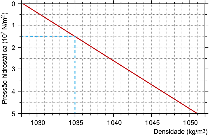 Obtemos que a pressão hidrostática é 1,5·107 Pa. Assim sendo, podemos calcular a profundidade da seguinte forma: