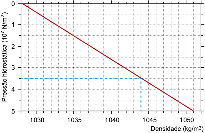 a) Utilizando o gráfico dado para descobrir a intensidade da pressão hidrostática quando a densidade da água é 1035 kg/m3.