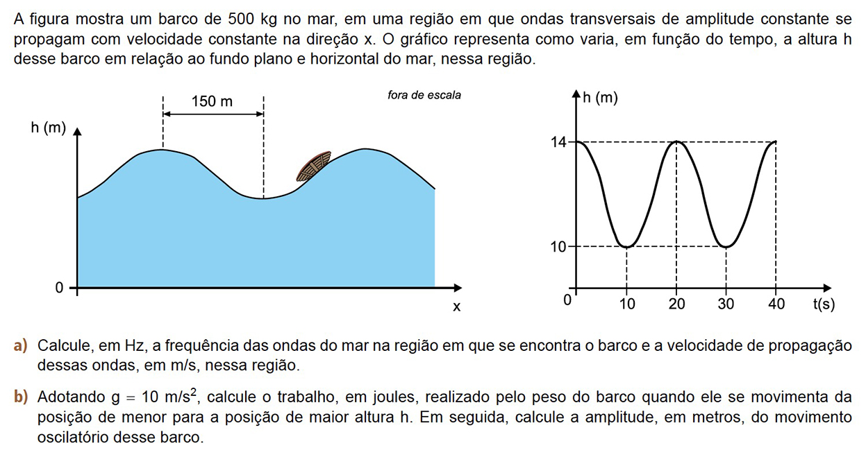 Além disso, da figura proposta pode-se concluir que o comprimento das ondas é de 300 m. Desse modo, a velocidade de propagação da onda pode ser determinada por meio da equação fundamental da ondulatória:
