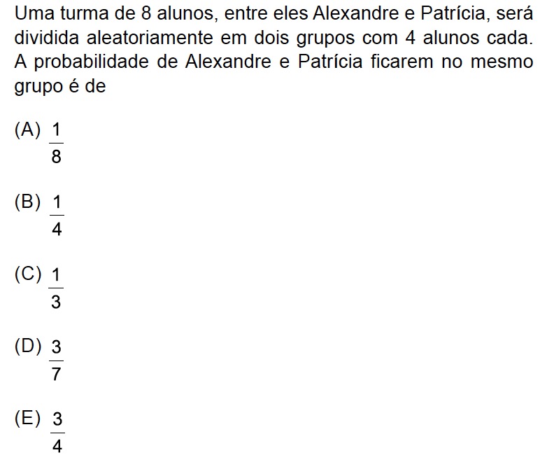 Evento: Alexandre e Patrícia juntos. Logo eles já ocupam dois lugares. Basta escolhermos mais 2 integrantes dentre os 6 restantes: . No entanto, Alexandre e Patrícia podem estar em quaisquer um dos grupos, logo, temos 30 possibilidades.