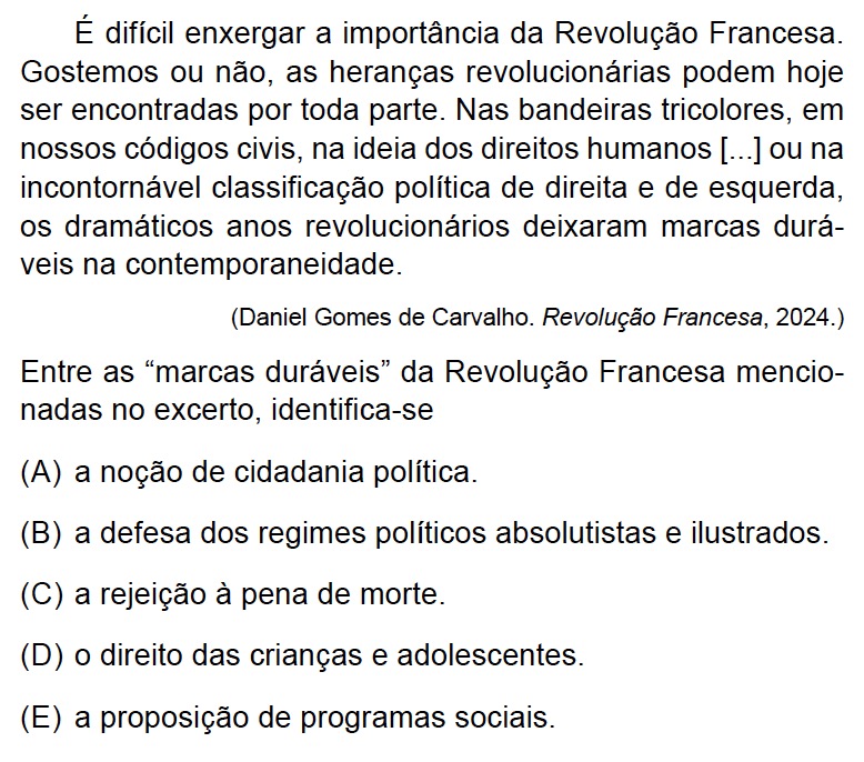 A Revolução Francesa deixou legados que ainda influenciam o mundo atual, visíveis nas leis, nos símbolos nacionais e na valorização dos direitos humanos. Entre essas heranças, destaca-se a noção da cidadania política, que reconhece os indivíduos como sujeitos de direitos, iguais perante a lei e participantes da vida pública. Essa concepção, surgida no contexto revolucionário, permanece como um elemento central das sociedades contemporâneas.
